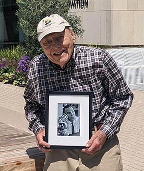 Image: John Mooring on a recent visit to SCDI. He is holding a photo of himself working at the microscope that he used to observe the patterns of chromosomes in sunflower hybrids which he created in the SCU greenhouse.