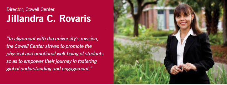 My name is Jillandra C. Rovaris and I am the Director of the Cowell Center. In alignment with the university's mission, the Cowell Center strives to promote the physical and emotional well-being of students so as to empower their journey in fostering global understanding and engagement. The Cowell Center provides excellent medical and psychological services and promotes the caring for the whole person. Our goal is to help students to take care of themselves so that they can better focus on succeeding academically and becoming the effective leaders of tomorrow.