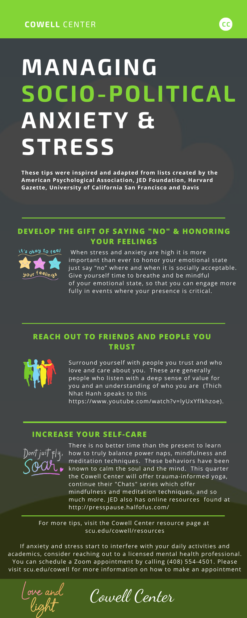 It is important during these times to plan ahead: balance and build in stress reduction. Toward that end, we have compiled some tips and sites for managing news and emotional overload.