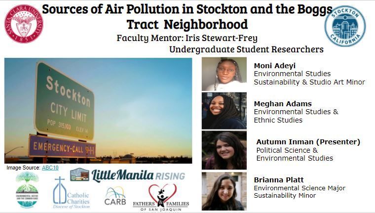 Autumn Inman (ESS '21) and Iris Stewart-Frey (ESS and the Environmental Justice and the Common Good Initiative) gave a presentation on "Sources of Air Pollution in Stockton and the Boggs Tract  Neighborhood" at a workshop entitled "Fighting for Clean Air - Community-Academic Partnerships for Clean Air in Stockton" on April 14th. The work Autumn presented grew out of a ESS senior capstone project conducted together with teammates Moni Adeyi (ESS, '21) and Bri Platt (ESS, '21), and followed up by EJ&CGI research assistant Meghan Adams (ESS, '21). The student team worked in coordination with student groups at Stanford University and UC Berkeley. Stewart-Frey co-organized the workshop together with leaders from local environmental justice community organizations, Catholic Charities, Little Manila Rising, and Fathers and Families of San Joaquin, as well as colleagues from Stanford University and UC Berkeley.
