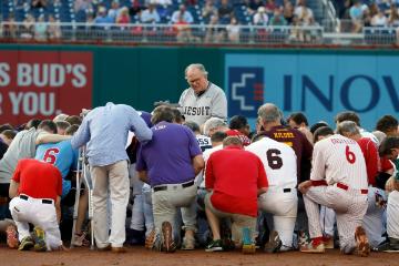 House Chaplain Fr. Patrick Conroy leads a prayer for the players during the 56th Annual Congressional Baseball Game for Charity.