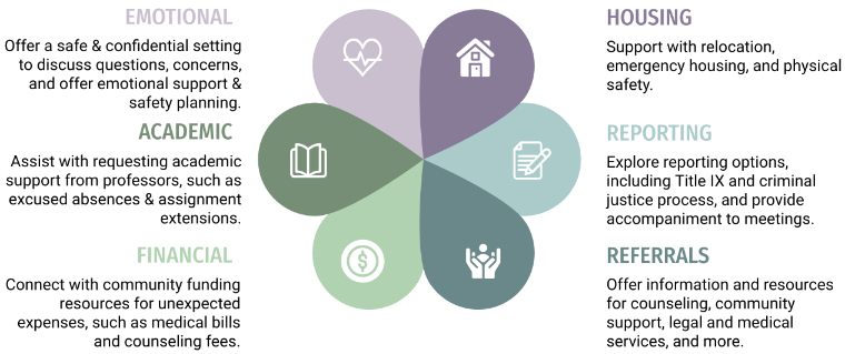 Confidential Advocates are here to listen, support, and empower survivors by providing a safe space for students to learn about their options and determine the course of action that best fits their needs. We may assist students in the following areas: